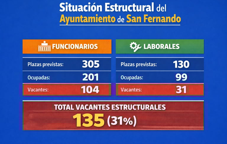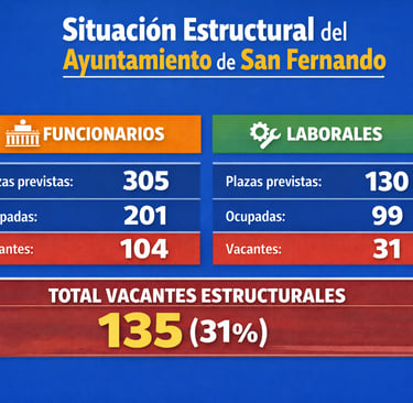 La ratio es elocuente: mientras Cádiz cuenta con un empleado por cada 108 habitantes, San Fernando tiene uno por cada 313. Incluso si se cubrieran todas las plazas previstas en la RPT isleña, la ratio sería de uno por cada 216 habitantes.